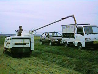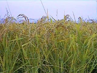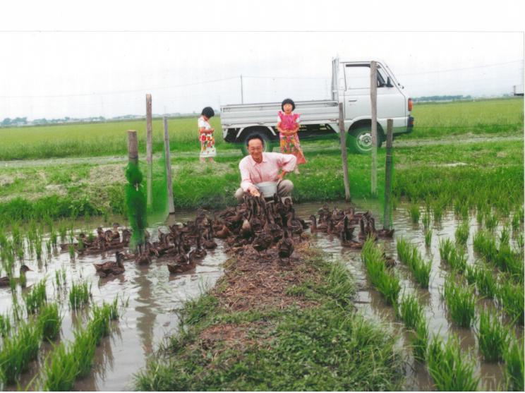 ○平成9年産「しょうもない米」の栽培体系 無農薬無化学肥料栽培は有機100%の発酵ぼかし肥料(商品名放線有機.エリート有機)を10・当たり50〜60・散布し、5 /14 に田植え、5/28に真鴨を田んぼに放ちました。餌のほうはくず米だけであります。昨年は鴨を入れるタイミングを逸し、ヒエを繁茂させてしまって「ヒエー」と悲鳴をあげてた反省をいかし、本年は早く入れたのはいいものの、稲までついばみはじめて、日一日と稲が無くなっていき7月10日過ぎには田んぼより引き上げざるおえませんでした。田んぼがてかてかと湖化していくさまには怖いものを感じました。 |